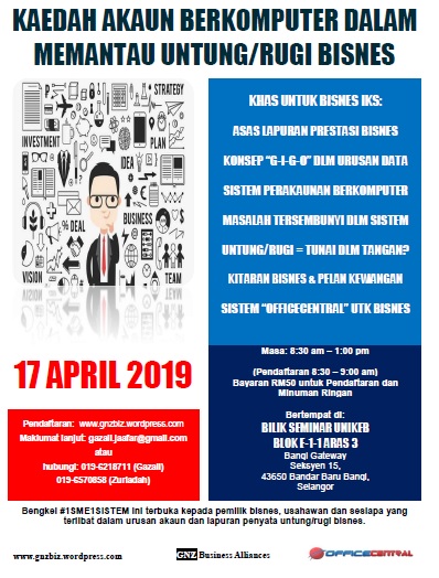 Seminar ini khusus buat usahawan dan sesiapa yang terlibat dalam urusan akaun dan lapuran penyata untung/rugi bisnes. Ianya diadakan pada 17 April 2019 di Bangi Gateway, Bandar Baru Bangi.